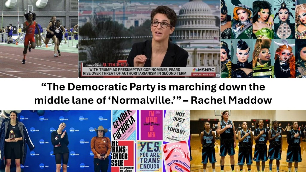 I’m trying to avoid politics, I really am, but sometimes you see something that is absolutely meme worthy and deserving of comment. The title above is a quote from Rachel Maddow, who on Wednesday, March 6, 2024, in an edition of “American Autocracy” told Nicole Wallace that “the Democratic Party is marching down the middle lane of ‘Normalville.’” (https://shorturl.at/fnANO)